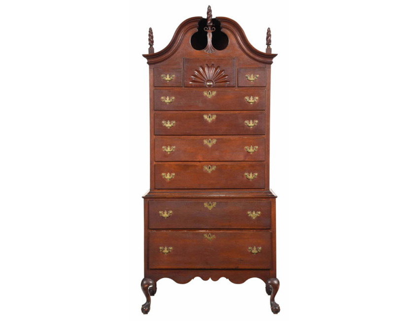 Having a closed bonnet with flame finials and a distinctive center plinth with a double scroll and a dropped, elongated shell. The central drawer with deeply carved lobed shell and two short drawers, above four graduated drawers, all flanked by reeded pilasters.